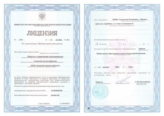 «Академия Трудоустройства» проводит обучение на основании образовательной лицензии и в полном соответствии с законодательством РФ. Учебный центр внесен в реестр аккредитованных организаций Министерства труда и социальной защиты РФ, оказывающих услуги по обучению в области охраны труда.